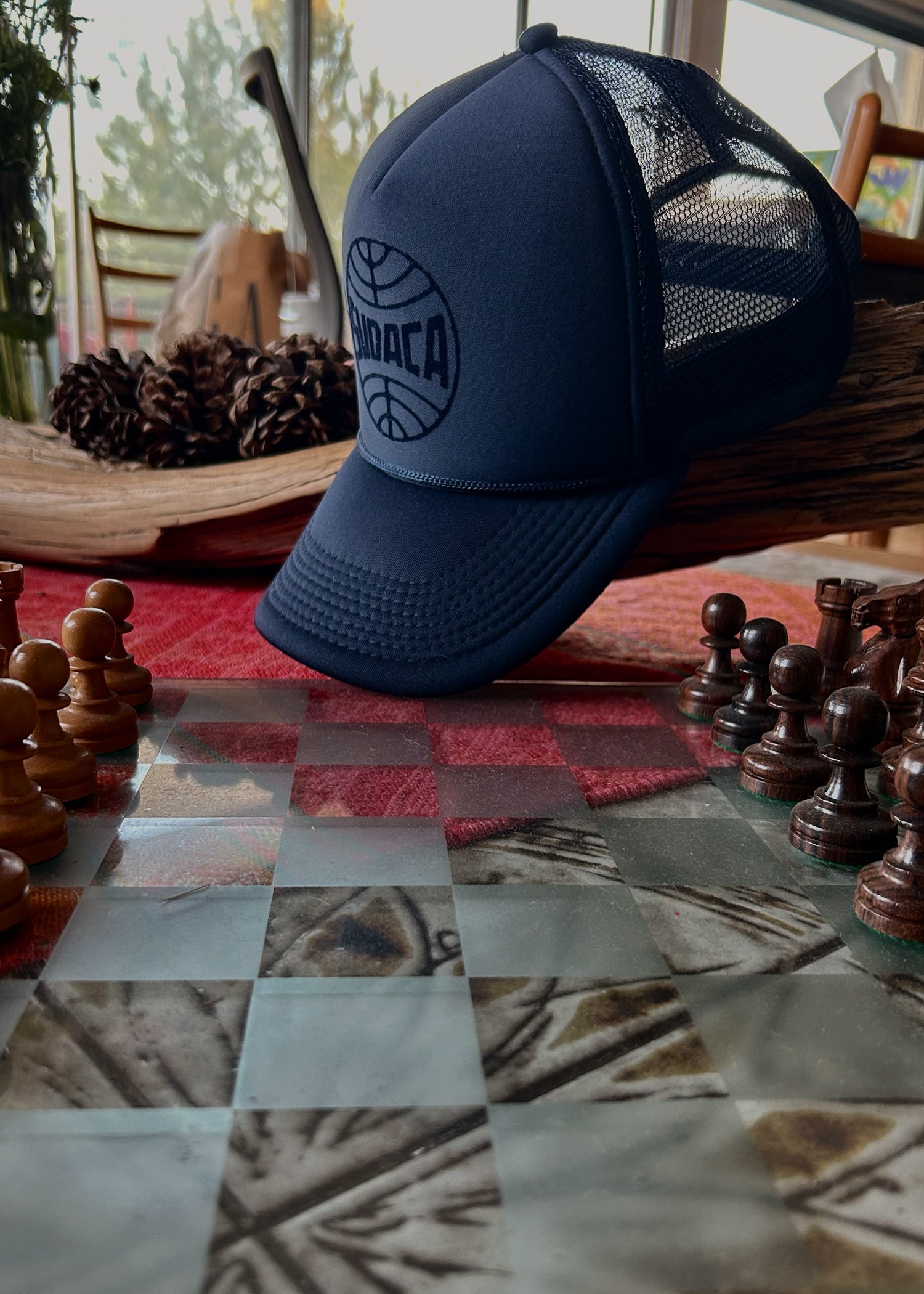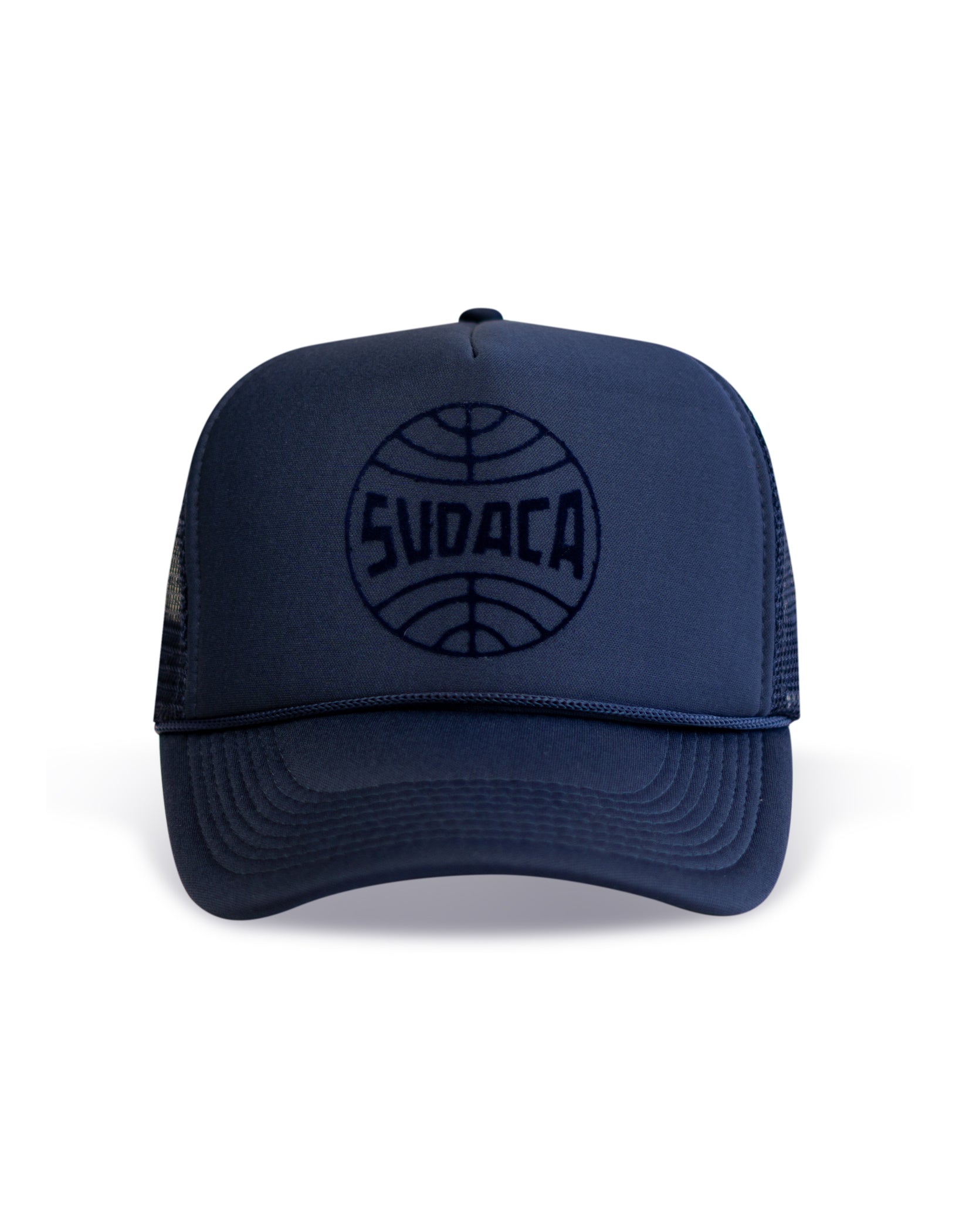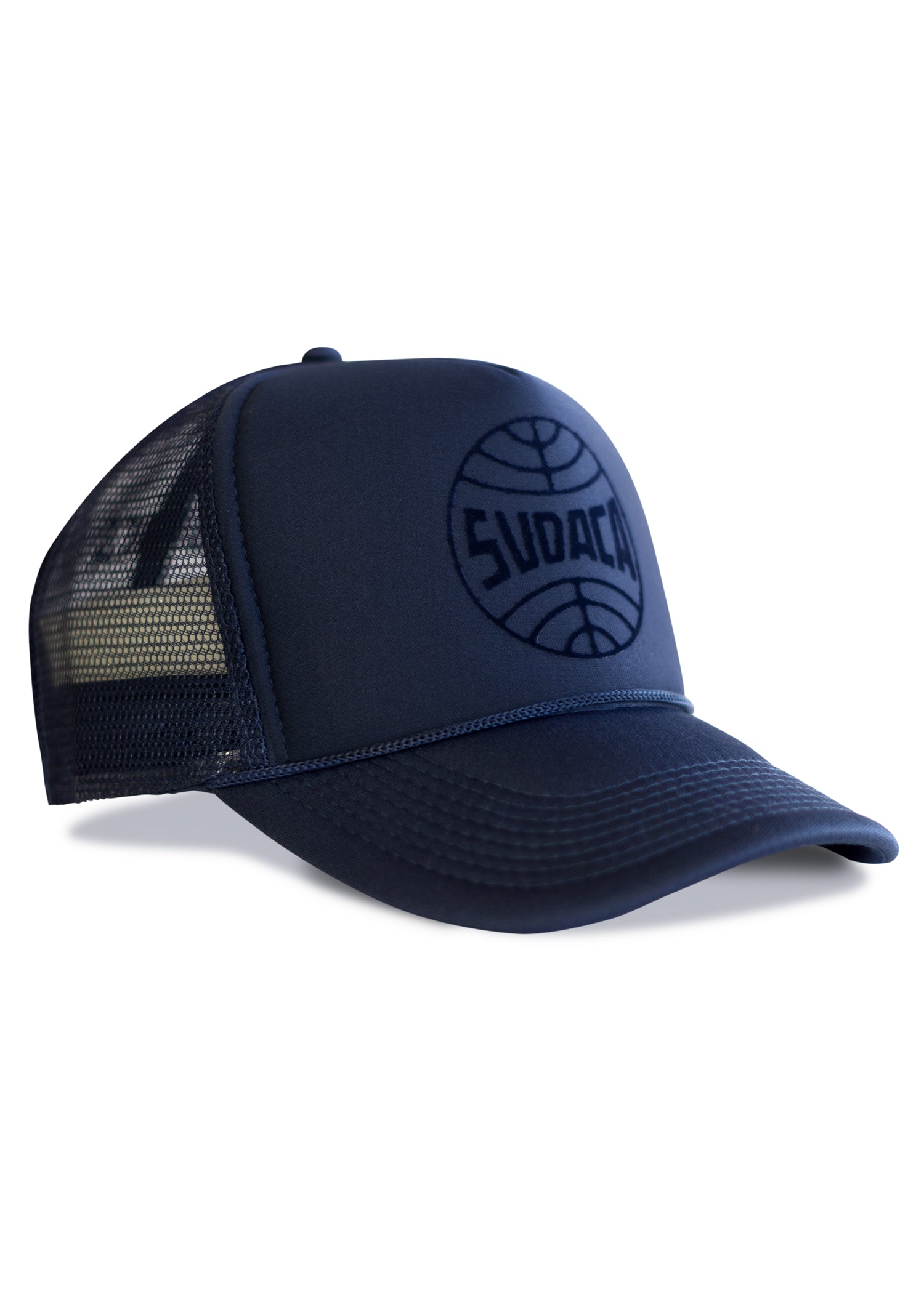 Classic trucker hat with snapback closure with our Sudaca logo on a flock finish at the center front and Sudaca's wordmark on the back.