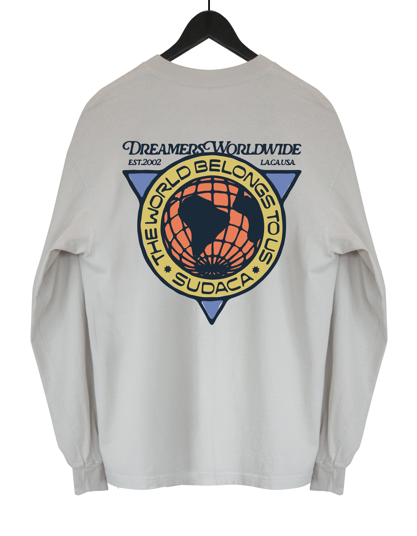 The World belongs to us. Esta camiseta de manga larga y cuello redondo está hecho en un tejido de punto jersey premium. Confeccionado en 100 % algodón pesado, ha sido pre-lavado y con un teñido reactivo para una mejor textura y durabilidad. Esta prenda esta hecha con un corte relajado para una mayor comodidad.